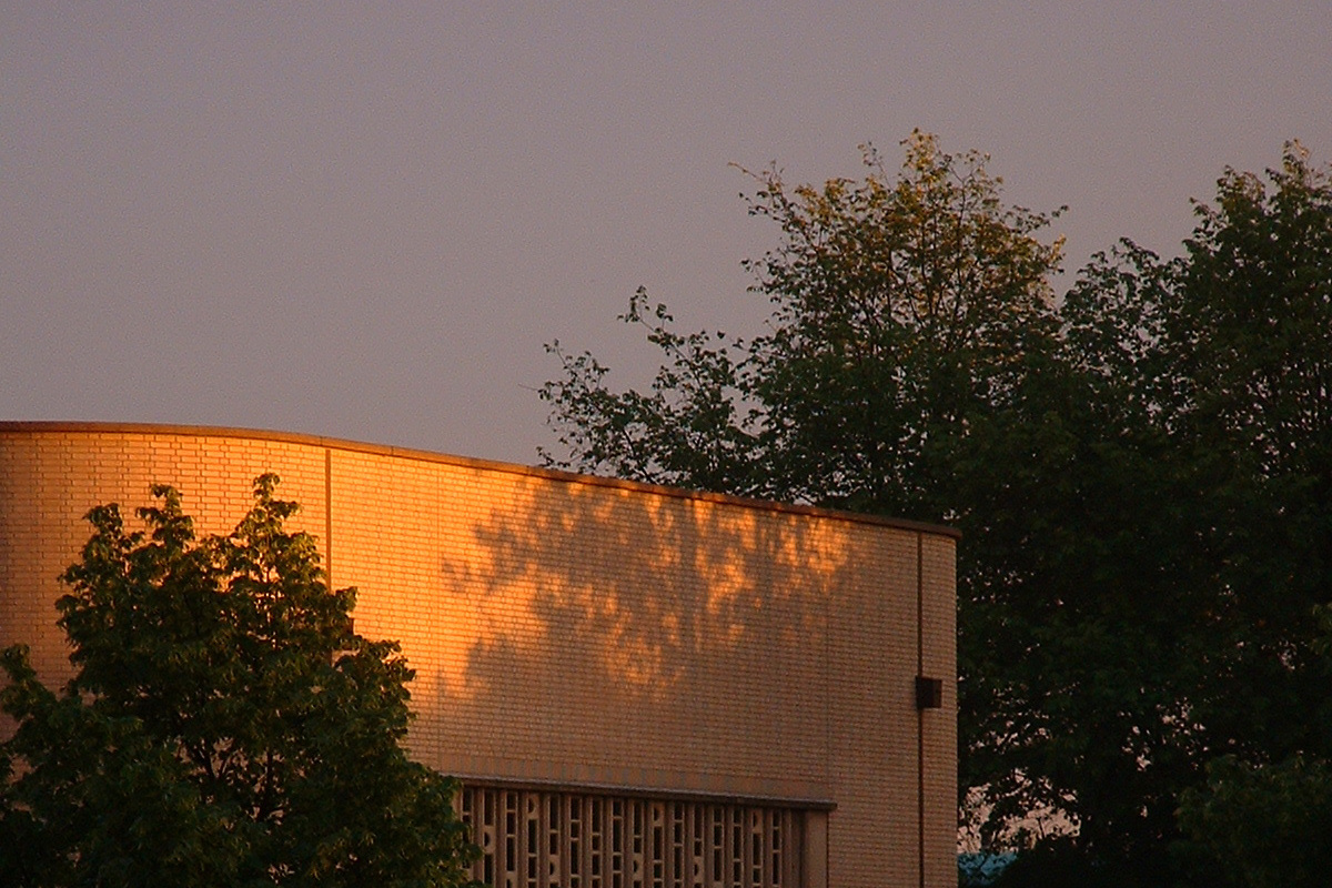 De ondergaande zon projecteert op een gevel de schaduw van een boom. Die schaduw sluit toevallig perfect aan op het profiel van de boom die achter het gebouw staat. Daardoor lijkt het net of de boom als een geest door het gebouw heen schijnt.