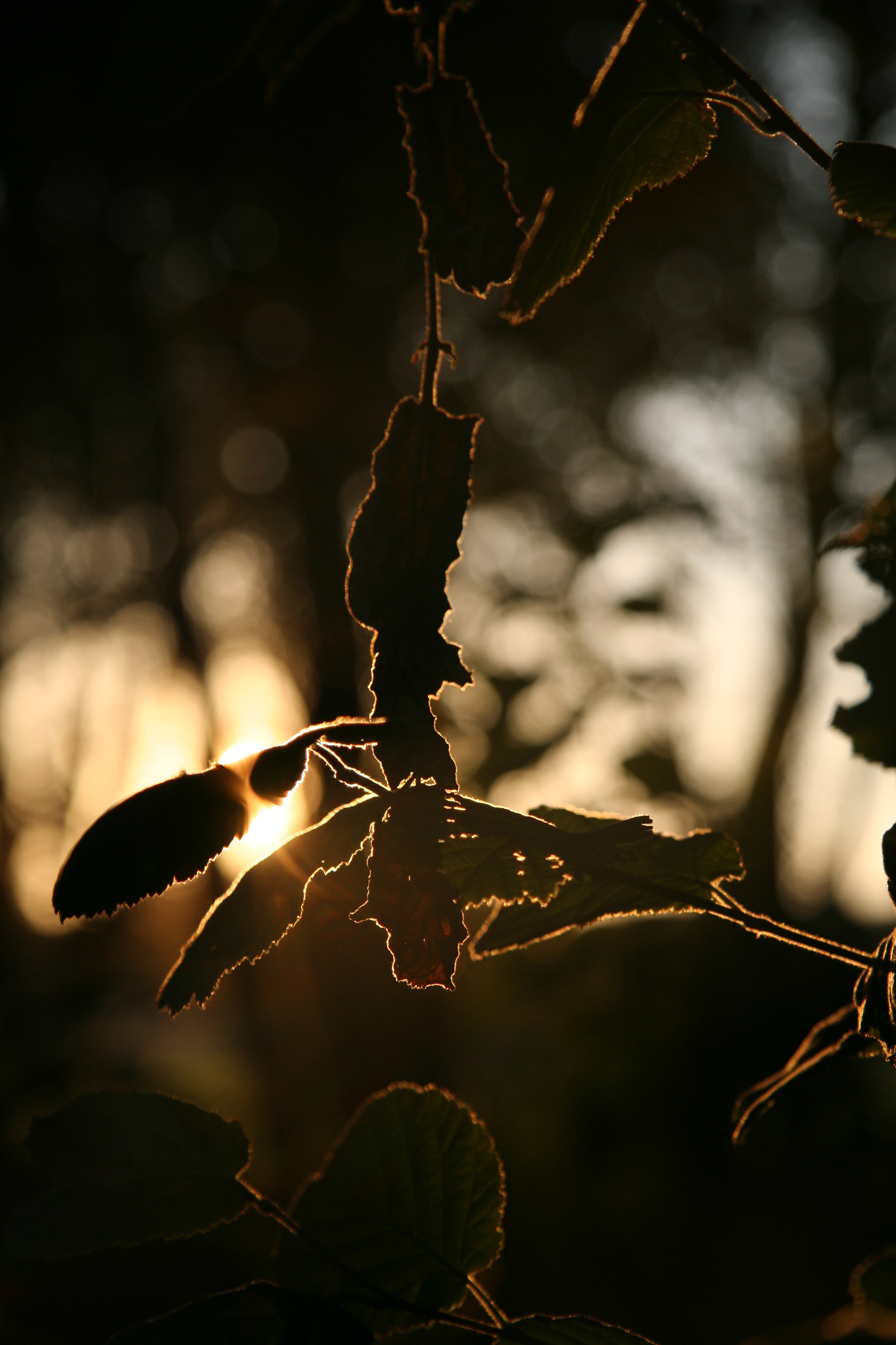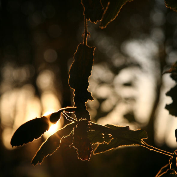 Laagstaande zon schijnt door een bosrand, ergens in Frankrijk. Met een beetje mikken kun je je camera zo manoeuvreren dat de zon een mooi gouden randje rond een boomblad tekent.