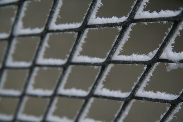 Het is weer eens tijd voor wat abstracter werk: de winter nadert, koude lijnen krijgen de overhand. De eerste sneeuw van het jaar, toen ik deze foto maakte, bestond uit miezerige naaldjes, die een fijn korstje vormden op het draadstaal van een hek.