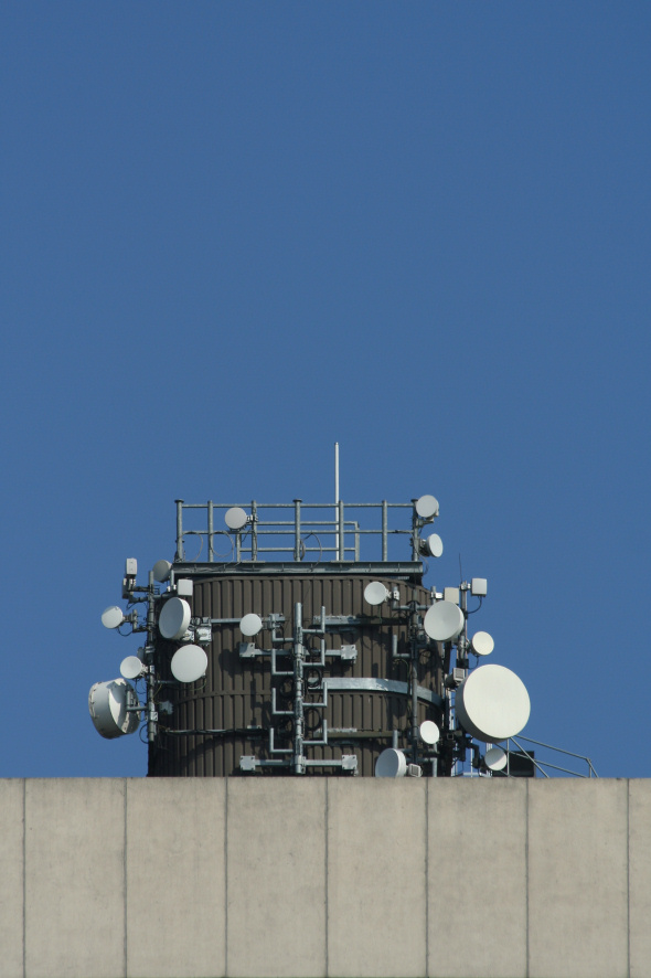 schotel(tje)s voor telecommunicatie bovenop een kantoorflat.