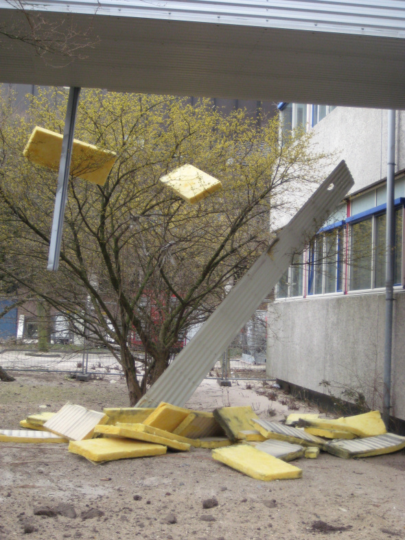 En ineens was het weg: het gebouw Aardwetenschappen. Wat op het moment van schrijven nog rest zijn wat opengebroken fundamenten en de restanten van wat eens de loopbrug was vanuit het Hans Freudenthalgebouw. De (gedeeltelijke) sloop van die loopbrug leverde dit plaatje op van artistiek gedrapeerde isolatiematerialen en staal. Als een requiem voor een verdwijnend gebouw.